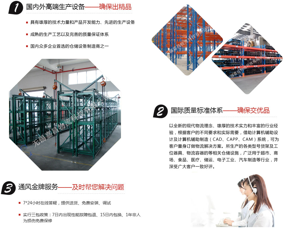 無錫嘉昌倉儲貨架有限公司主要產(chǎn)品有:鉚釘貨架、角鋼貨架、中型貨架、重型貨架、懸臂式貨架、流利式貨架、重力式貨架、壓入式貨架、模具架、閣樓貨架、鋼平臺、密集架、線棒架、自動化立體倉庫貨架以及周邊配套設施(托盤、周轉箱、倉儲籠、堆垛架、物流臺車、零件盒、工具車、工具柜、工作桌、文件柜、更衣柜、小推車、輥道輸送線、網(wǎng)片隔斷、液壓升降平臺以及液壓搬運車等)。